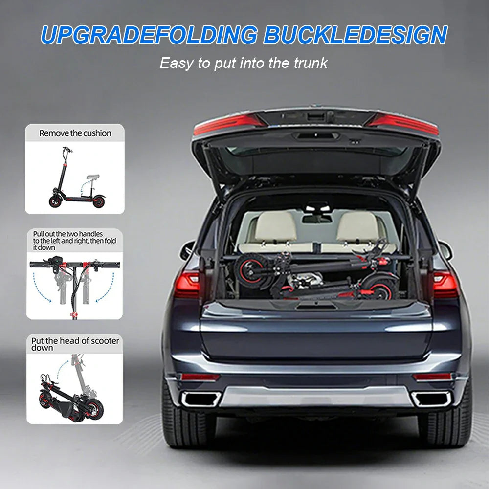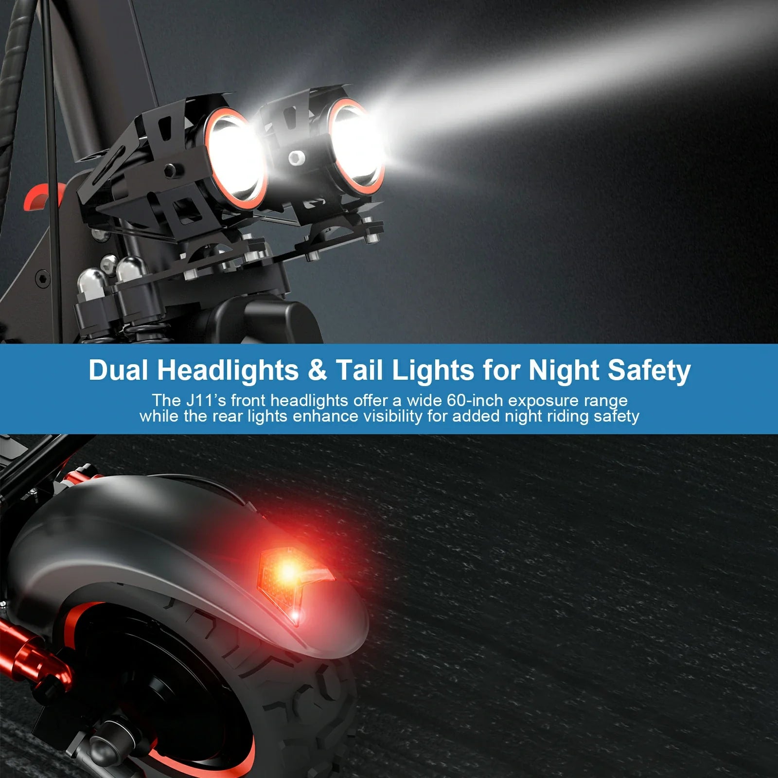 1. 1200W motor 2. Double suspension for comfort 3. 11โ off-road tires 4. Front & rear LED lights for night visibility.