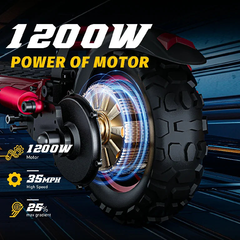 1. 1200W motor 2. Double suspension for comfort 3. 11โ off-road tires 4. Front & rear LED lights for night visibility.