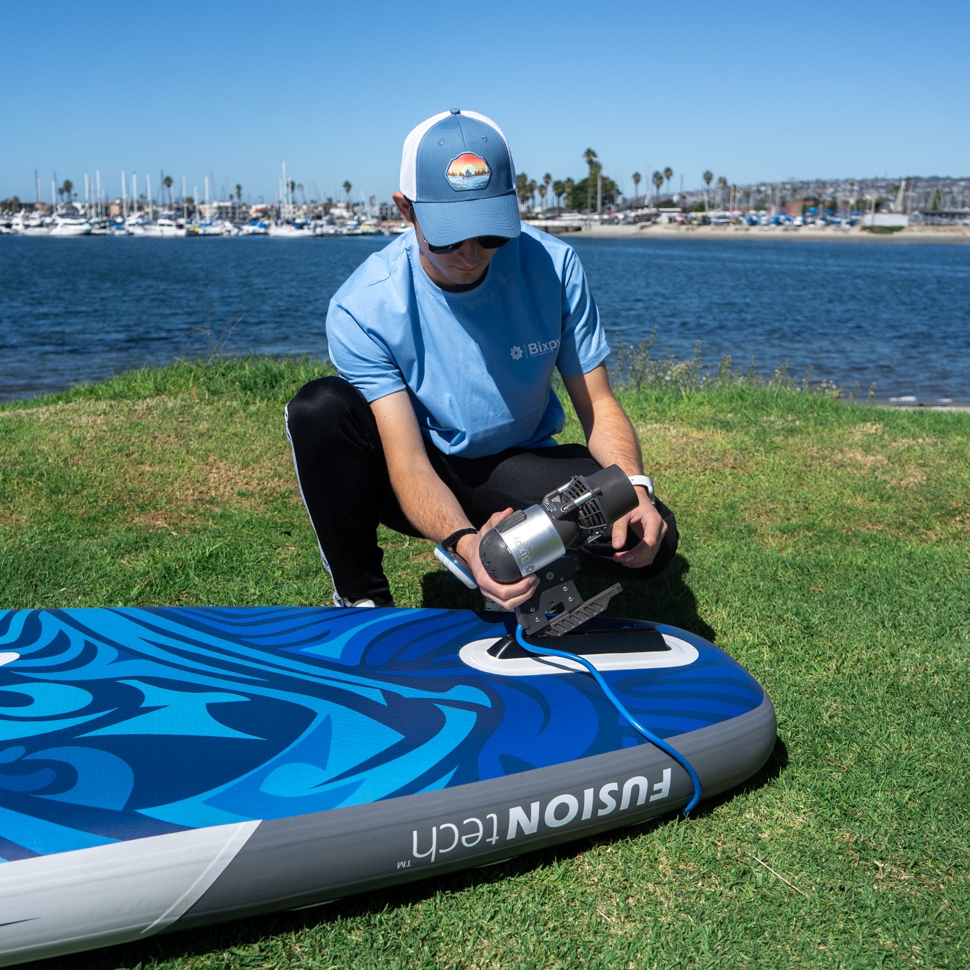 The Nixy/Bixpy K-1 Outboard Kit - US Fin Adapter Bundle includes the mounting adapter designed for Nixy paddleboards. This kit contains everything you need to motorize your board with ease. It installs directly into the fin box using Bixpy's US Fin Mount Adapter and can achieve speeds up to 5mph (depending on model and load). Steering is done with a paddle.