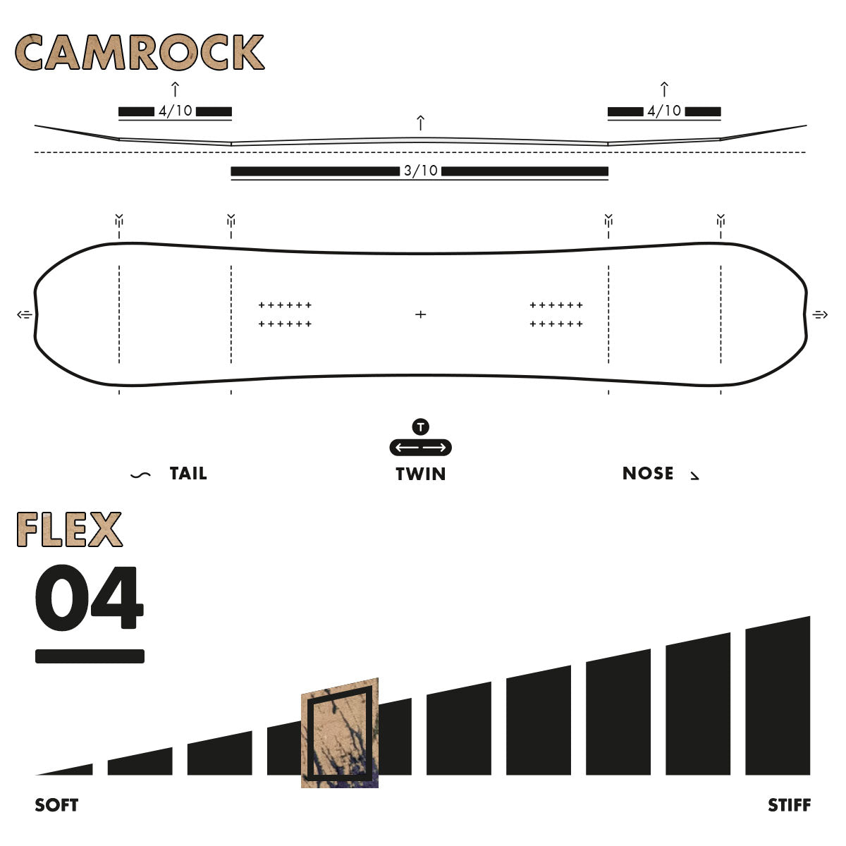 CAMROCK PROFILE, IDENTITY SHAPE: CamRock features a loaded camber section between the feet with a small flat section underfoot and rockered tips. The camber section maintains stability between the feet, while the flat areas underfoot let you load up ollies and the rockered tips offer forgiveness. This creates a very playful, easy turning board. The Original Identity shape saves material and weight and also stands up without tipping over like other rounded boards.