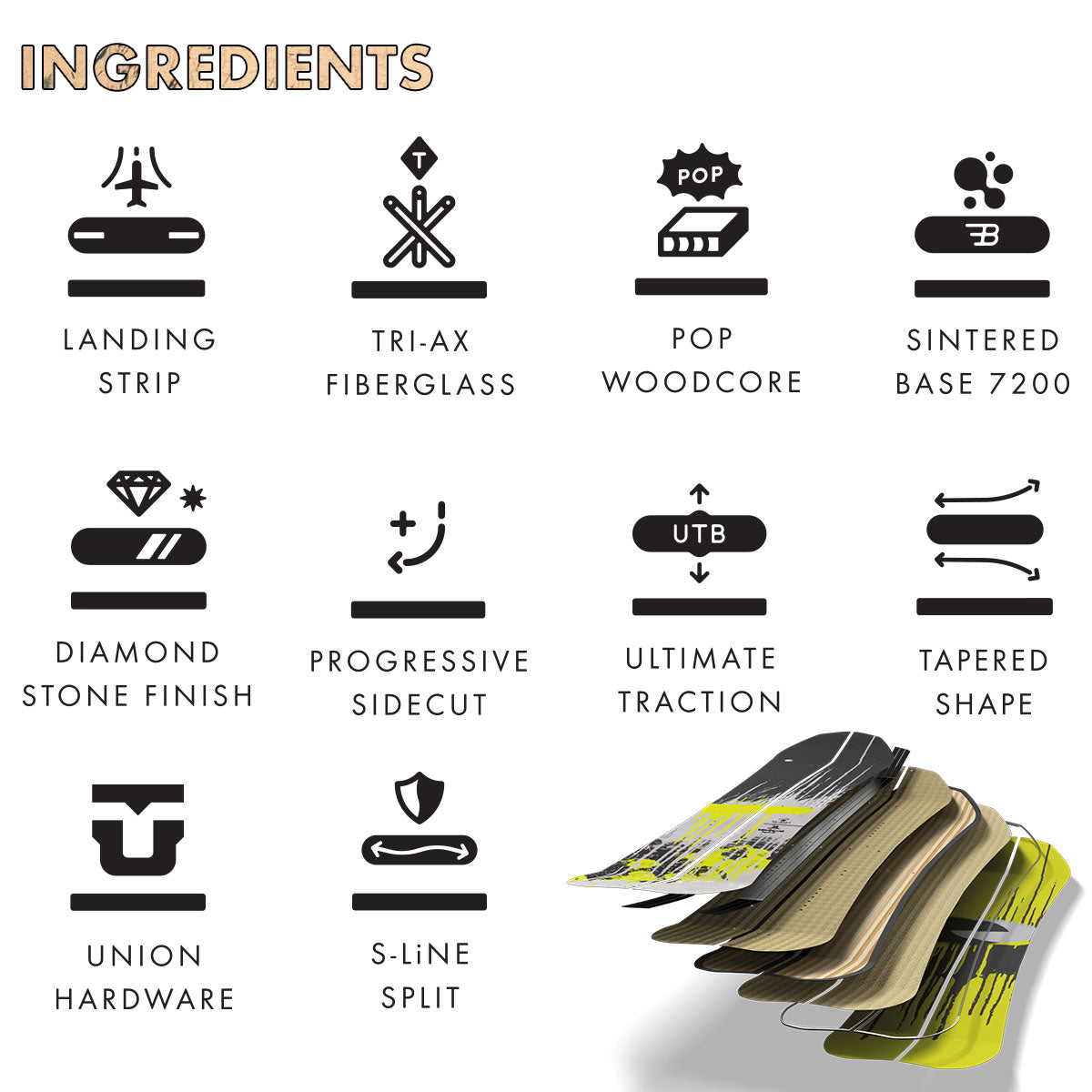 TRI-AX FIBERGLASS, POP WOODCORE, FACTORY WAXING: Triax fiberglass is the time-tested classic. It features a three-way weave of premium fibers with strands running at 45-degree angles. It provides superior pop, consistent torsional flex, and more overall response. Arranged with premium strips of poplar for a lightweight and smooth flex with added beech hardwood stringers tip to tail through the inserts for power transfer and durability. All Slash boards are factory waxed with OneBallJay wax and ready to shred straight out of the wrapper.