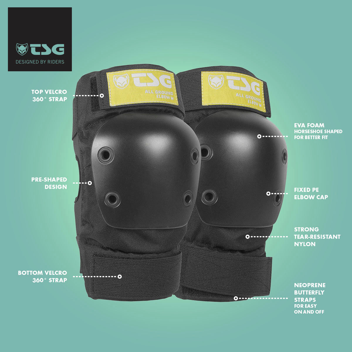 The TSG All Ground Elbow Pads are for serious riders who need pads that can withstand slams in pools and backyard ramps. Durable high-grade fabrics with double stitching, EVA impact foam and flat, high-density caps guarantee great protection and wear. Open-backed design with neoprene butterfly closure and 360° straps.