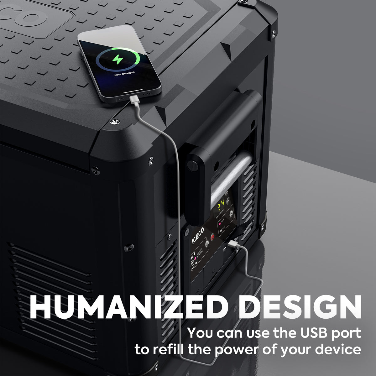 Humanized Design: Weatherproof control panel; Easy to clean the refrigerator box with drain hole. Internal Led Light; Max&Eco Mode; 3 Battery Protection Level.