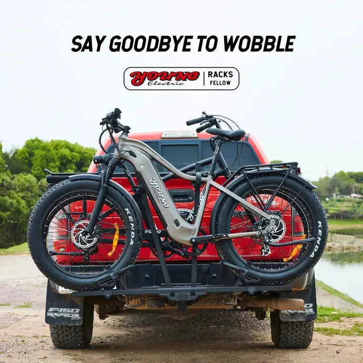 The Young Electric FELLOW foldable hitch eBike rack has a weight capacity of 200 LBS and the ability to hold two eBikes weighing up to 100 LBS each. With adjustable sliders, it can accommodate wheelbases up to 50'' and is compatible with all bikes and electric bikes with tire widths under 5'' in width. The wobble-free design features an arc-shaped wheel holder that provides stability and prevents movement during transportation. The scratch-resistant design includes silicone straps and soft pads for superior protection. The foldable design allows for easy storage while the iron frame, electrophoretic coating, and spray paint finish provide excellent rust resistance and can withstand salt corrosion for up to 1000 cycles. The FELLOW foldable hitch eBike rack offers convenience, durability, and security during transport.